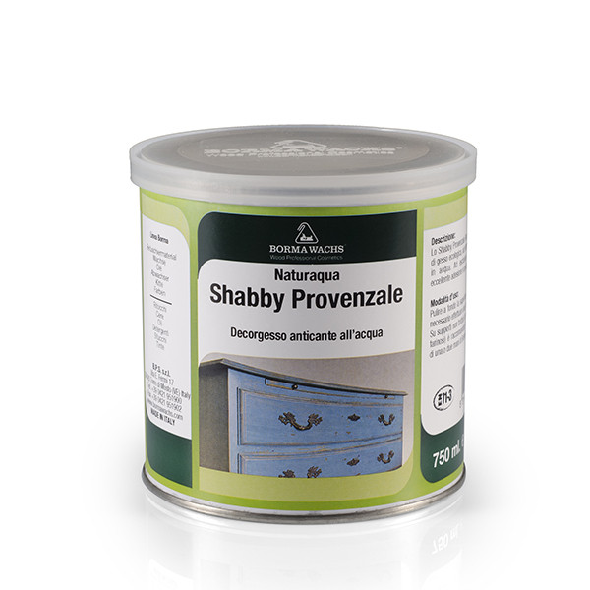 Вінтажна, гіпсова фарба Шеббі, Shabby Provance, Borma Wachs Опис: Фарба на основі натуральної крейди й акрилового полімеру, що підходить як для дерева, так і для стін. Завдяки високому твердому вмісту дає змогу отримати гарне наповнення, роблячи поверхні однорідними з декількома застосунками. Завдяки гарному розширенню та гнучкості, він дає можливість ідеально гладкого оброблення під час шліфування. Можливе використання лакофарбового покриття з використанням фарб на водній основі та основі розчинників, воску, шелаку. Кольори та спеціальна формула Kreide Farbe роблять його особливо придатним для отримання пошарпаного шикарного та провансальського оздоблення. Переваги: • Матеріал розроблений на водній основі, без запаху • Містить у своєму складі гіпс, що надає поверхні шовковистості та матовості. • Висока в“язкість дає змогу створювати унікальні 3D-ефекти • Матеріал надзвичайно простий у застосуванні: легко наноситься пензлем, не вимагає попереднього очищення поверхні від старих лакофарбових шарів. • Для захисту покриття рекомендується використовувати віск, олії та лаки з асортименту Borma Wachs. • Стандартна палітра містить 35 світлових кольорів Рекомендації щодо застосування: • Під час роботи з лакованою поверхнею, злегка відшліфуйте її зерном 180-220. • Очистьте> поверхню від забруднень і пилу • Нанесіть перший шар пензлем, розпорошенням або валиком • Просушіть поверхню впродовж 3-5 годин • Для досягнення найкращого результату, рекомендується проміжне шліфування • Для створення ефекту «втрати» локально нанесіть Slipperwax або Softwax, потім нанесіть другий і третій шар • На відлипання 30-60 хвилин • Повне сушіння 3-5 годин • Завершіть декор воском, оліями та лаками з асортименту Borma Wachs. Колірна палітра 50 822 08 9001 100 7014 2005 101 107 109 152 145 60 116 129 1034 120 119 81 31 133 132 130 137 142 153 144 150 148 127 128 125 1515 126 122 Провансальський стиль оброблення: Для оздоблення цього типу, переважно нанесіть один або два шари Shabby Kreide Farbe пензлем, 130-150 грамів/м2, як базове покриття. Після повного висихання ви можете нанести третій шар іншого контрастного кольору, щоб покрити певні частини або навіть усю поверхню. Через 3-5 години відшліфуйте останній шар наждачним папером 220-400, залежно від кількості матеріалу, належного видалення. Stripped Shabby Effect: Для оздоблення цього типу, переважно нанесіть один або два шари Shabby Kreide Farbe пензлем, 130-150 грамів/м2, як базове покриття. Після того як базове покриття висохне, нанесіть на зацікавлені точки поверхні (зазвичай краї, але так само добре на площинах) за допомогою стирання, прозорого наповнювача Softwax Filler. Потім нанесіть третій шар загалом, іншого кольору з базового шару. За допомогою Scotch-brite видалити Kreide Farbe, де Softwax Filler запобігає прилипанню. У цих точках ефект матиме смугасту поверхню, з фактичним утворенням недосконалості за товщиною між двома шарами гіпсової фарби. Виробництво: Італія