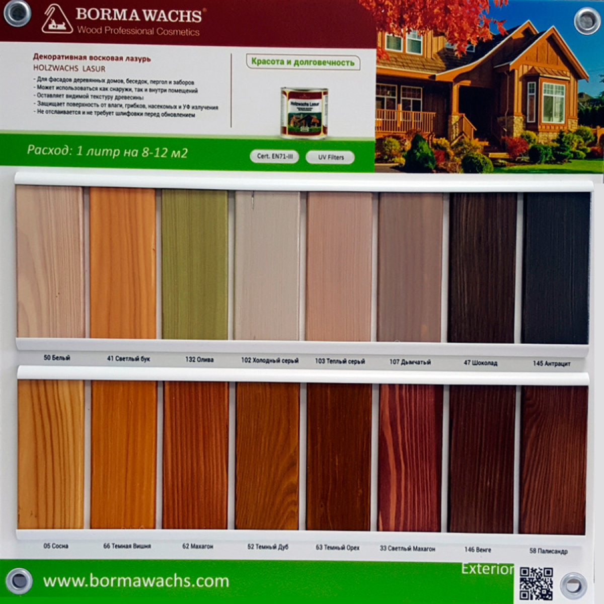 - Палітра містить напівпрозорі світлостійкі кольори, що поліпшують природну красу деревини;