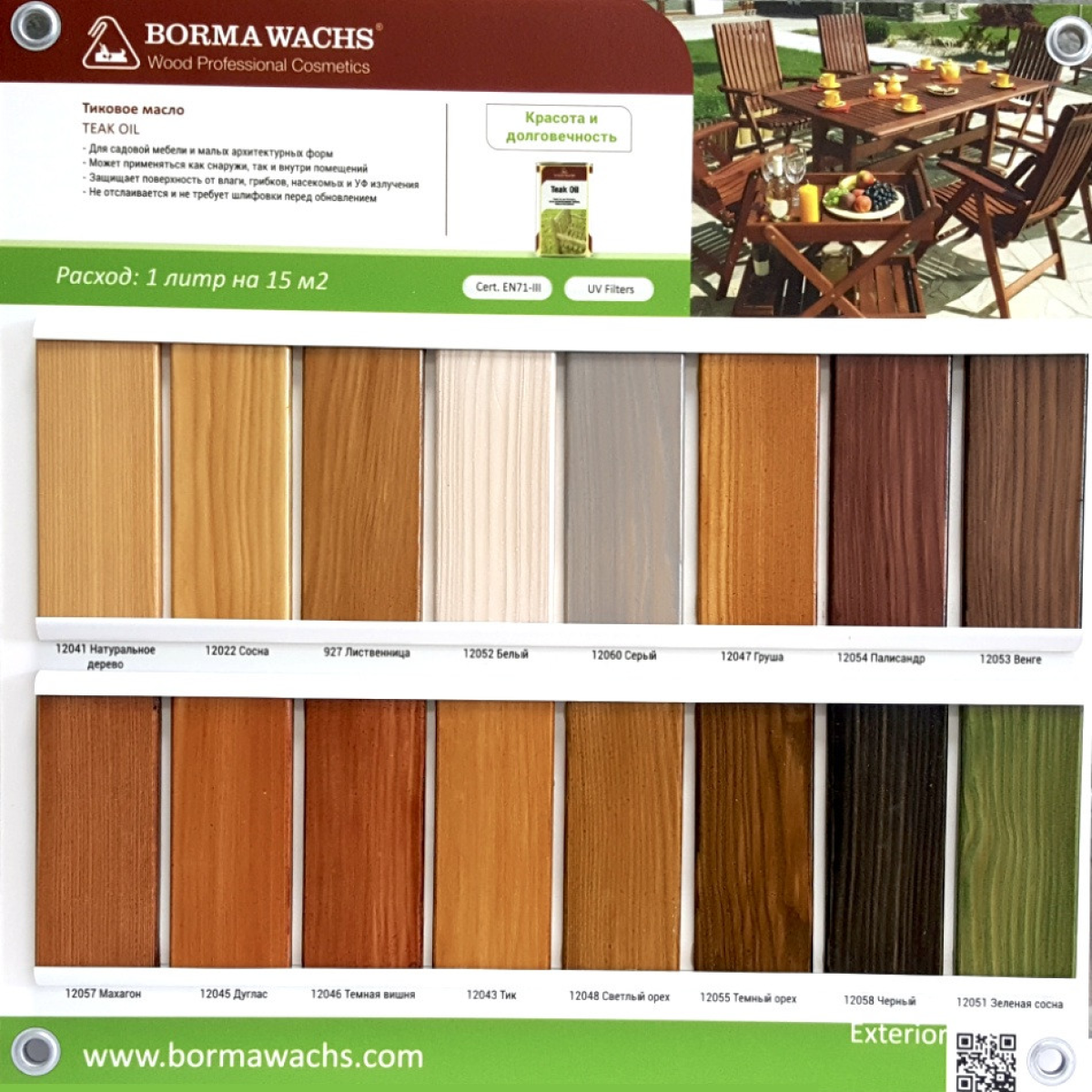 Тикова олія, Teak Oil, Borma Wachs Colors: Уточнюйте наявність 70 171 172 301 511 581 621 631 927 1011 1461 601 1471 Опис: Продукт на олійній основі, готовий до використання, підходить для всіх дерев“яних поверхонь, як внутрішніх, так і зовнішніх. Це робить поверхню водовідштовхувальною й надає поверхні приємного зовнішнього вигляду. Також підходить для занурення. Захищає від атмосферних і біологічних агентів і підвищує природну красу деревини. Прозорий або в кольорі. Він не відшаровується й не вимагає шліфування. Його можна використовувати окремо як періодичне оброблення поверхонь або у формі кольорової основи перед оздобленням прозорою олією (наприклад, олива для настилу HD — данська олія). Порада технолога: За потреби отримати кольорове покриття, можна замовити в найближчого дилера BORMA колерування оливи Teak Oil за системою COLOR OIL SYSTEM, або попередньо пофарбувати деревину за допомогою Декоративної воскової лазурі Holzwachs Lasur або Захисно- декоративного просочення Holzlasur. Сфера застосування: ліжка, мансарди, балки, перекладини, рами тощо. Спосіб нанесення: - ретельно збовтати перед застосуванням продукт готовий до застосування, за потреби може бути розбавлений очищеним скипидаром; - легко наноситься за допомогою пензля, тканини, валиком і фарбопультом; - можливе нанесення 2-го шару з інтервалом 4-6 годин (давши можливість висохнути першим слоєм); - кількість шарів: 2 або 3; сушіння займає 8-12 годин за температури 20 °C; - повне сушіння займає 24 години; витрата 8-12 кв. метрів. на 1 літр. залежно від типу деревини. Уважно: - Легко займається, берегти від дітей; - У разі виникнення пожежі використовувати СО2 хімічні реагенти (сухі у формі піни). Ніколи не використовувати воду. - У разі ковтання негайно звернутися по медичну допомогу, показавши цю етикетку. Тара: 125 мл./500 мл. /1 літр /5 литров Виробництво: Італія